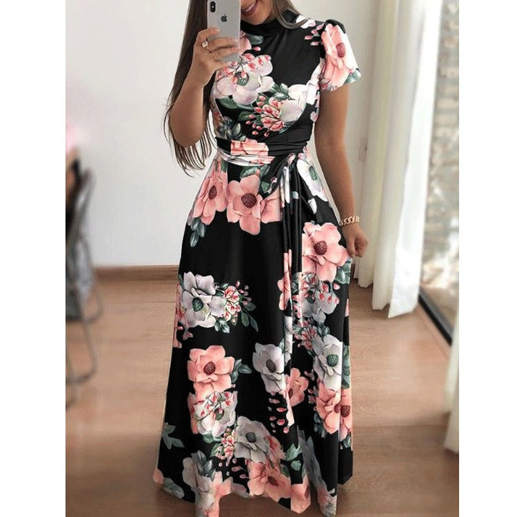 hot autumn new European and American style flower print short sleeve big swing dress women's clothing